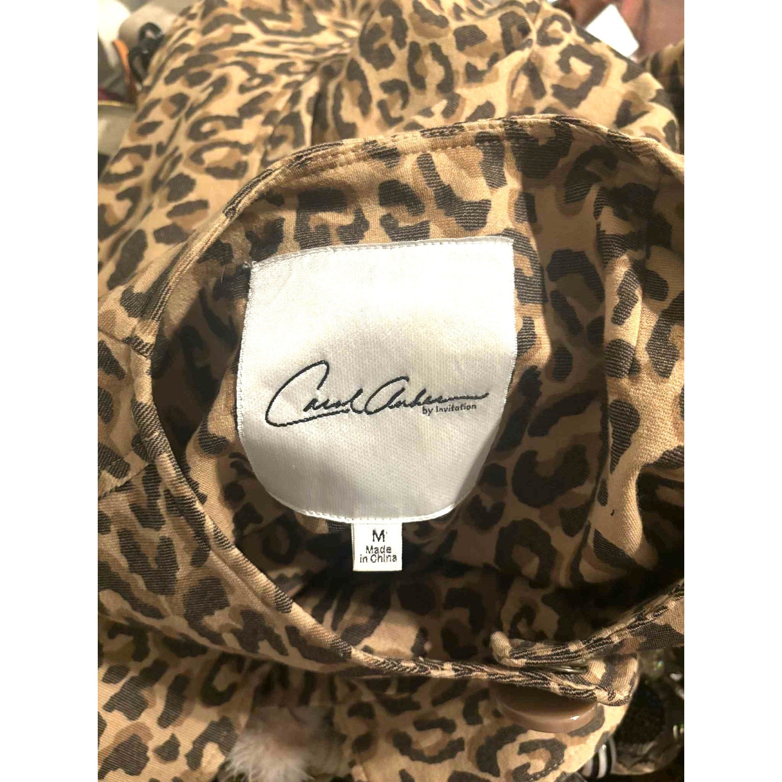 If your first name starts with the letter "H" you're in luck! This gorgeous all-time favorite vintage cabi jacket has a cursive "H" faintly embroidered on front right. The coat is a retro look with 3/4 sleeves, resin large button at neck and mid-length. Leopard print is HUGE for fall! Note: I have another size M without the "H" on front. Unlined. Made of Cotton, Nylon and Spandex. Great stretch to fabric!