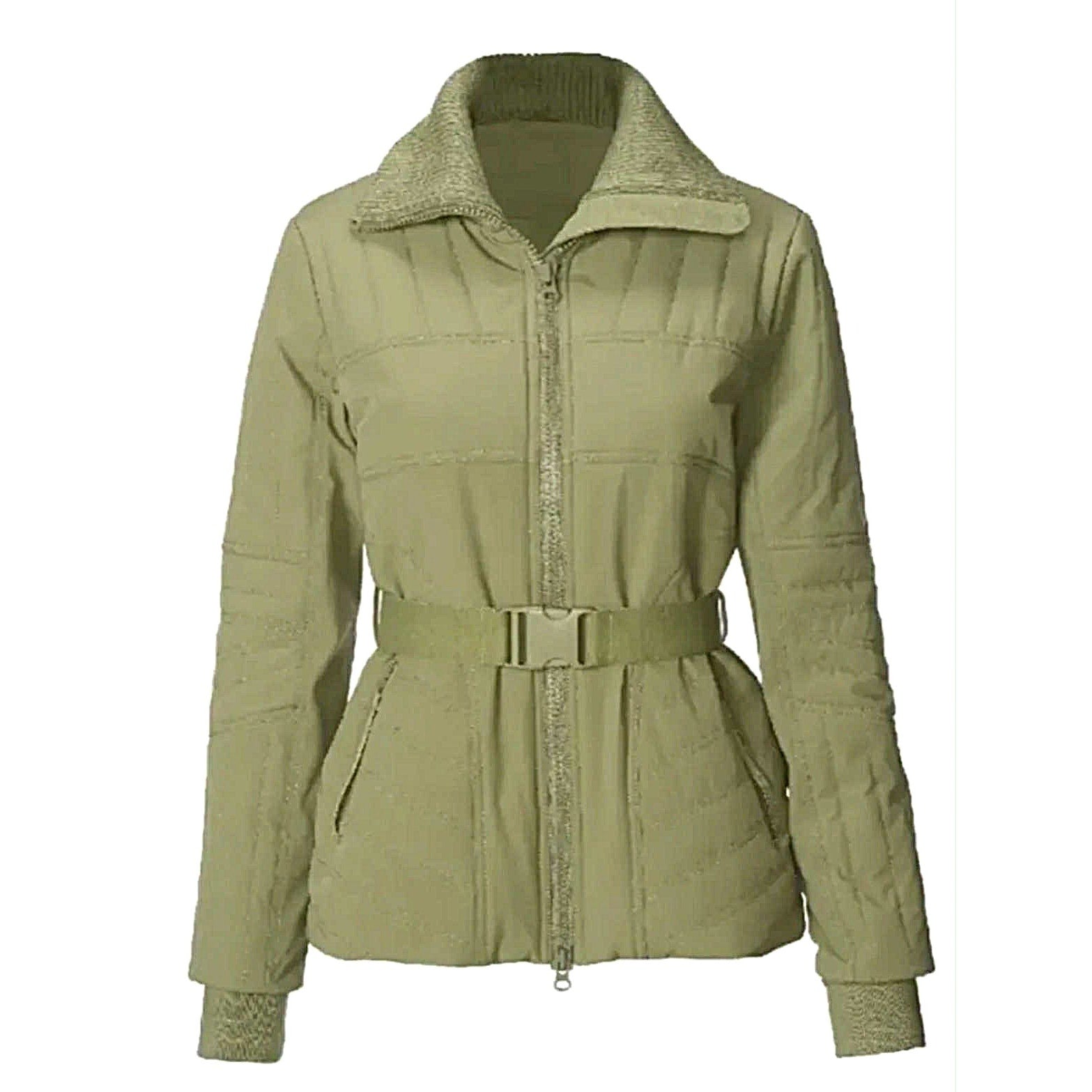 Stylish Cabi Lift Puffer Jacket in sage green, size L. Designed for women who want to stay comfortable and fashionable during the chilly winter and fall seasons, this short-length jacket features a solid pattern and long sleeves to keep you warm. The outer shell material is made from high-quality nylon, making it both durable and lightweight.