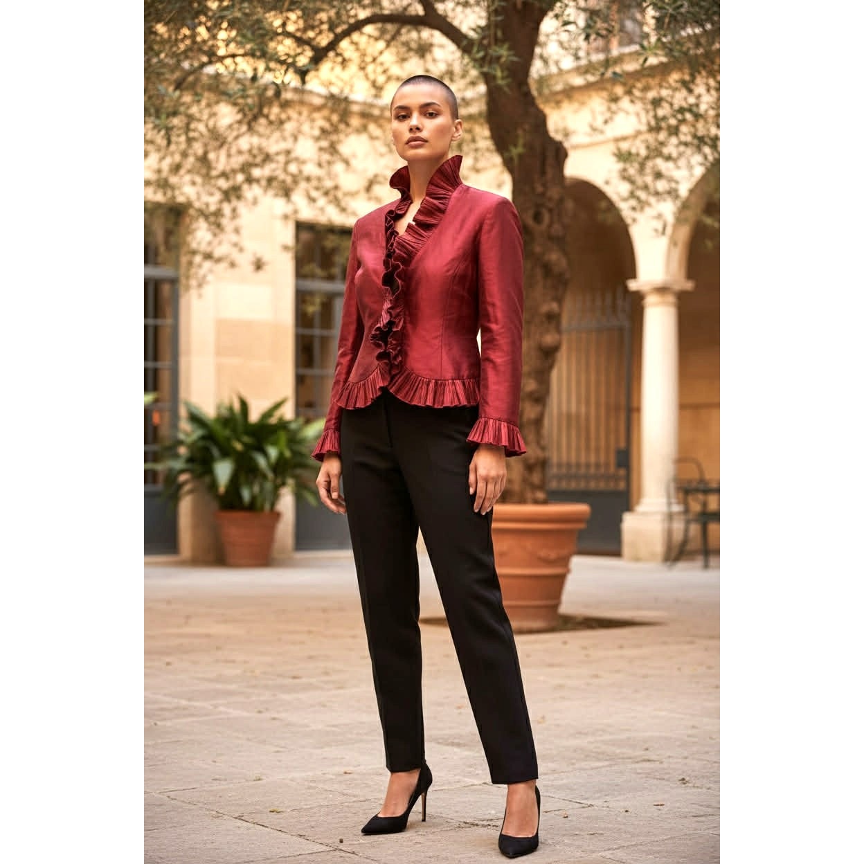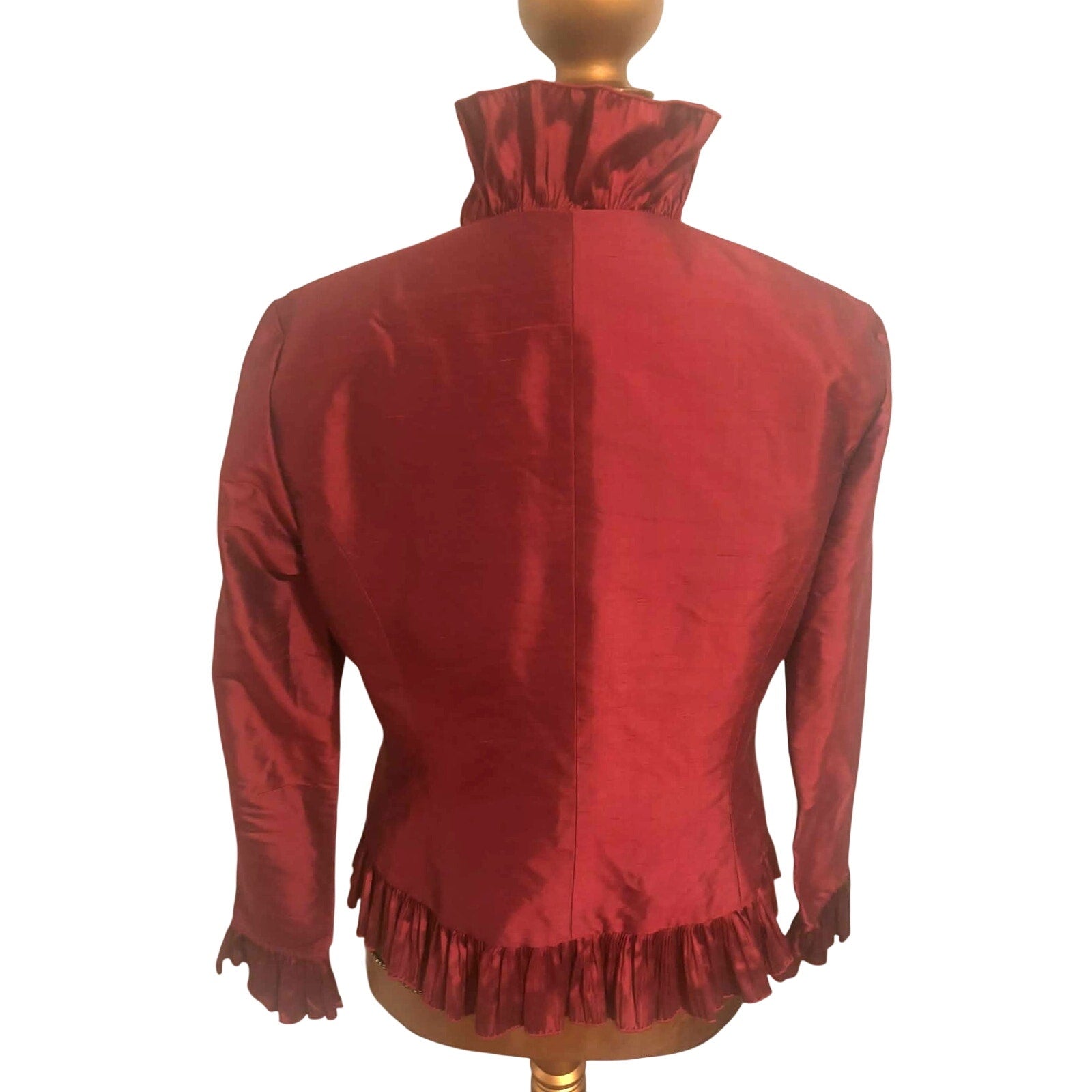 Lafayette 148 New York silk jacket in a rich cranberry red tone. Crafted in 100% silk with elegant ruffle detailing along the front, collar, cuffs, and hem for a romantic yet tailored silhouette. Beautiful structure with a soft sheen typical of fine silk shantung. Made in New York City, reflecting the brand’s earlier high-end production.