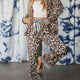 Bring effortless glam to any outing with this head-turning two-piece set. A bold leopard print meets sporty striped trim for a look that’s equal parts fierce and fun. The button-front shirt layers beautifully or stands on its own, while the matching drawstring pants keep things comfy with a relaxed, slightly stretchy fit. Handy pockets add everyday practicality, so you can go from brunch to night out without missing a beat.