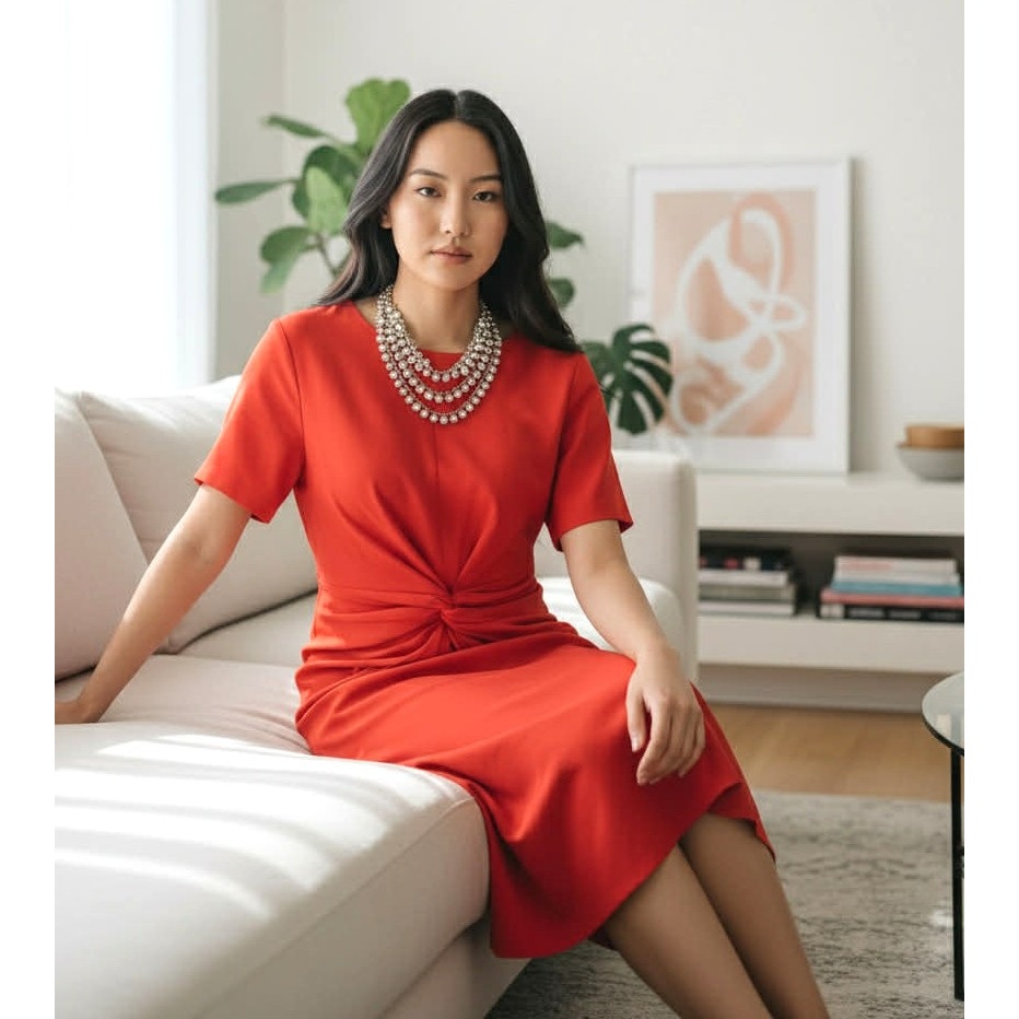 Beautiful Böhmé bright orange midi dress in a breathable viscose and linen blend. Features a flattering knot-front detail, short sleeves, and a clean tailored silhouette that works for career wear, events, or elevated everyday styling. Brand new with original tags attached. Lined.