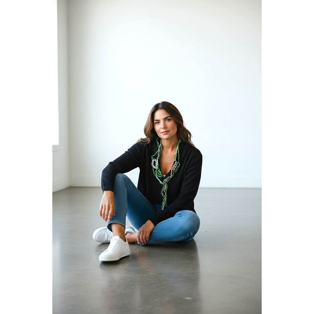Elevate your wardrobe with this classic, structured Ming Wang knit jacket featuring a black body accented with bold green and white ruffled ribbon trim. Designed in a flattering silhouette with a front hook-and-eye closure, this chic piece adds instant polish whether worn casually or dressed up.