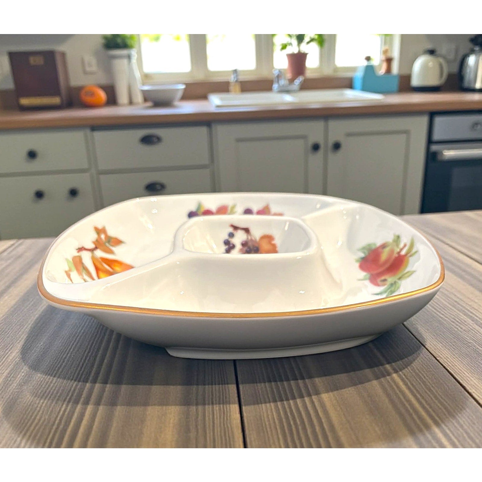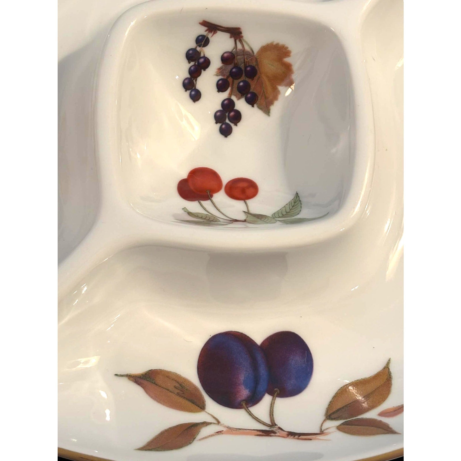 Classic Royal Worcester Evesham divided serving dish featuring hand-decorated fruit motifs including plums, apples, pears, cherries, and berries, accented with a delicate gold rim. This versatile piece includes three outer sections and a center well, ideal for relishes, appetizers, nuts, dips, or condiments.