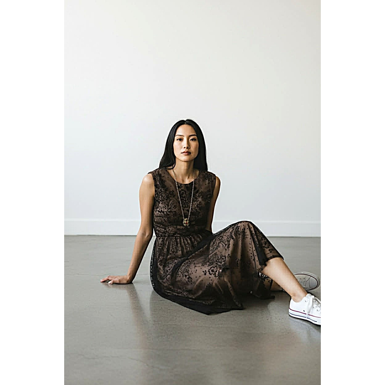 • Fabric: Sheer black flocked overlay with velvet-textured floral design