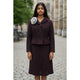 This sophisticated set features a rich plum-purple mohair fabric with a beautifully tailored jacket and matching mid-length skirt. Details include a three-button front, notched collar, and elegant mid-century structure that captures Dior’s iconic “New Look” aesthetic.