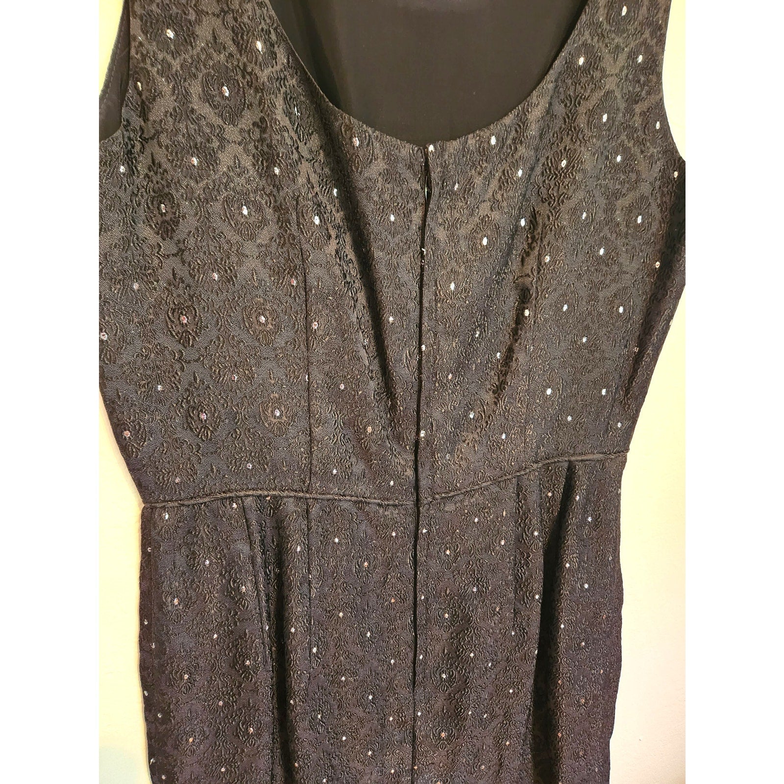 ONLY ONE!!! Vintage 1960s Black Sleeveless Brocade Cocktail Dress w/Silver Metallic Dots ~ Size M/L