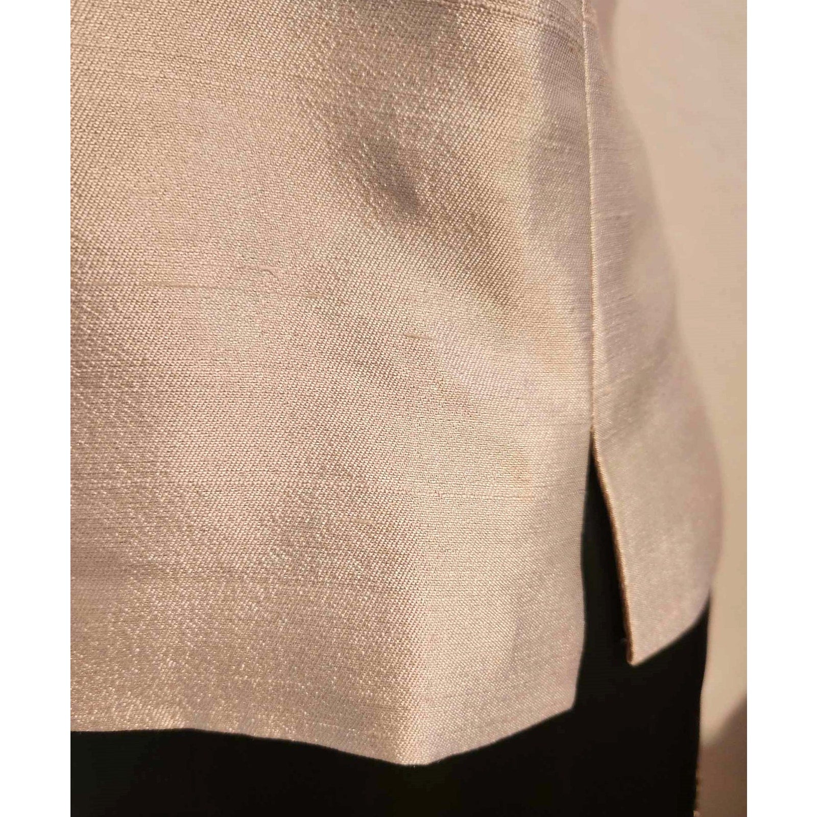 The natural raw silk offers a subtle sheen and slubbed texture in a versatile tan shade. A rare size Large in true vintage, perfect for collectors, vintage weddings, formal events, and polished retro workwear.