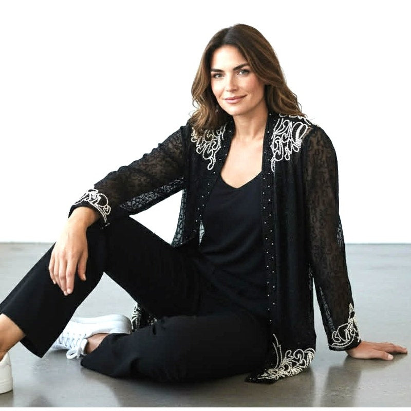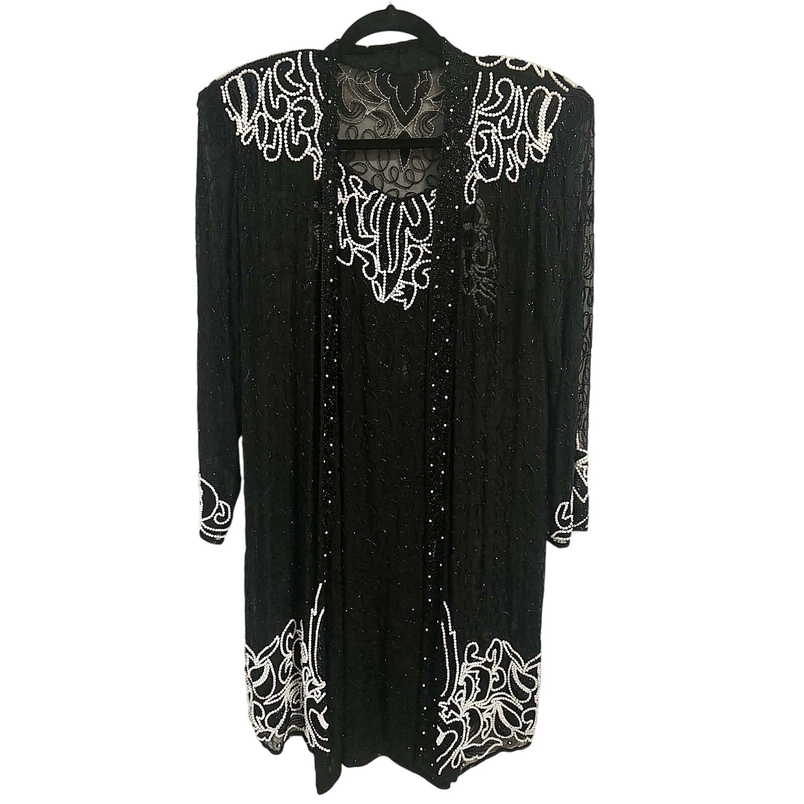 Stunning vintage two-piece evening set featuring a black silk beaded dress with a matching sheer jacket, adorned with intricate beadwork and tiny pearl details. Elegant, timeless, and beautifully crafted, this set makes a statement whether worn together or styled separately.