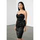 Bring on the glam with this stunning vintage Gunne Sax by Jessica McClintock strapless black satin cocktail dress. Features a sweetheart neckline, ruched bodice, curve-hugging silhouette, and an oversized bow with rhinestone detail at the hip — classic early-2000s formal style.