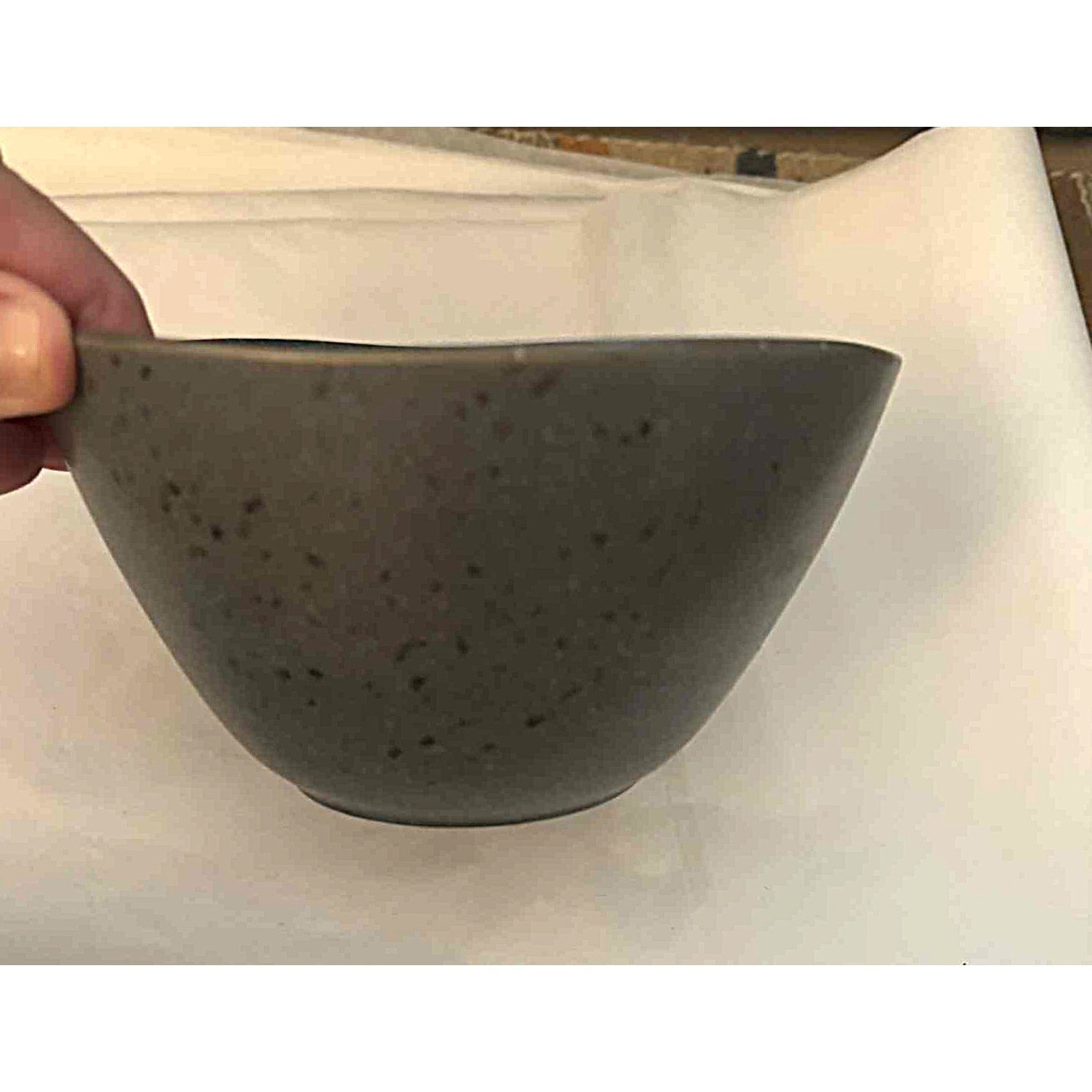 Hand-thrown studio stoneware bowl by Hanselmann Pottery (Corrales, New Mexico). Early HP hand-painted signature on base (pre-stamp era). Asymmetric rim with abstract multi-glaze design in charcoal, rust, teal, and speckled gray. Wheel-thrown with trimmed foot ring.