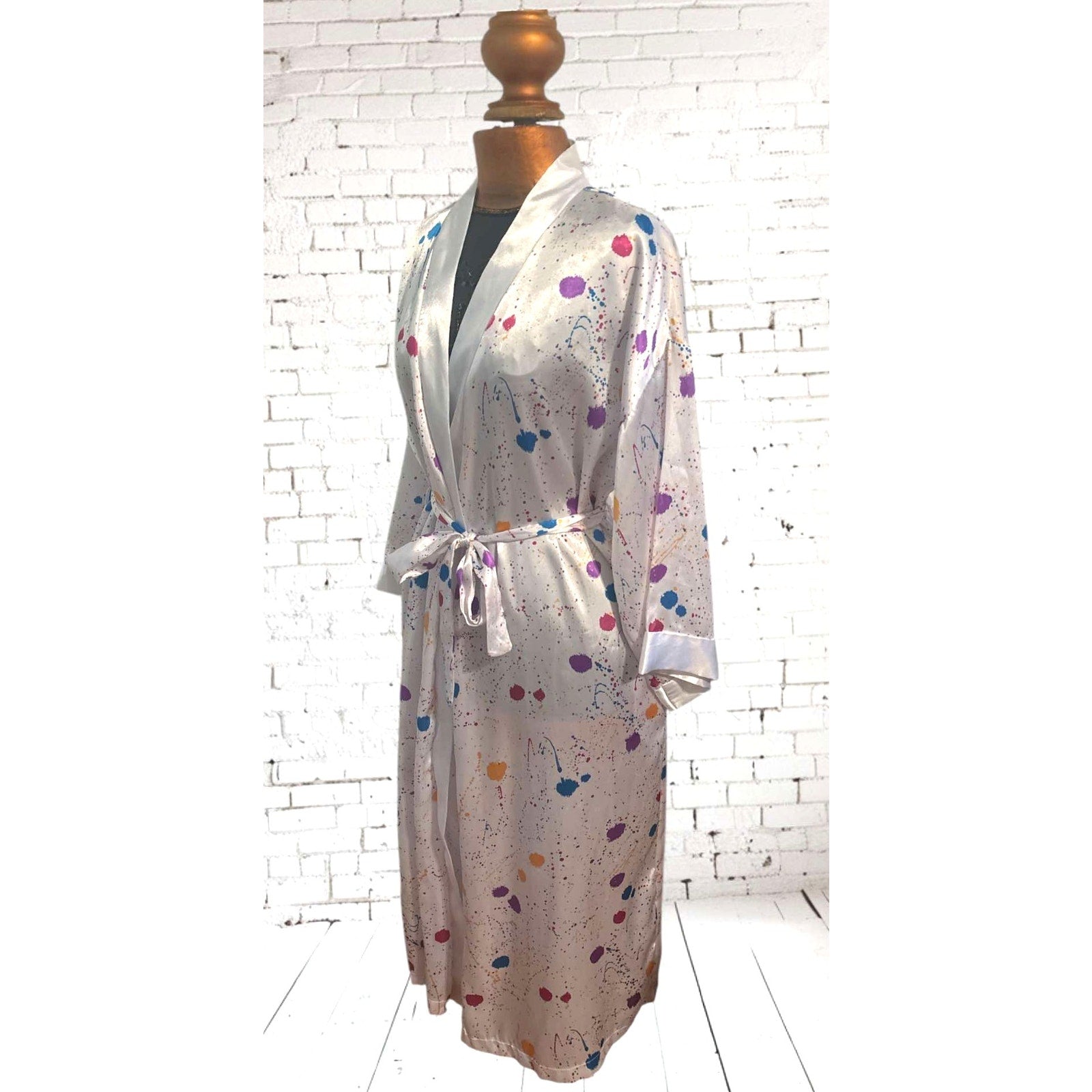 Stunning vintage robe in wonderful condition! Long white satin with colorful paint splatters and polka dots. Original matching belt and pockets!