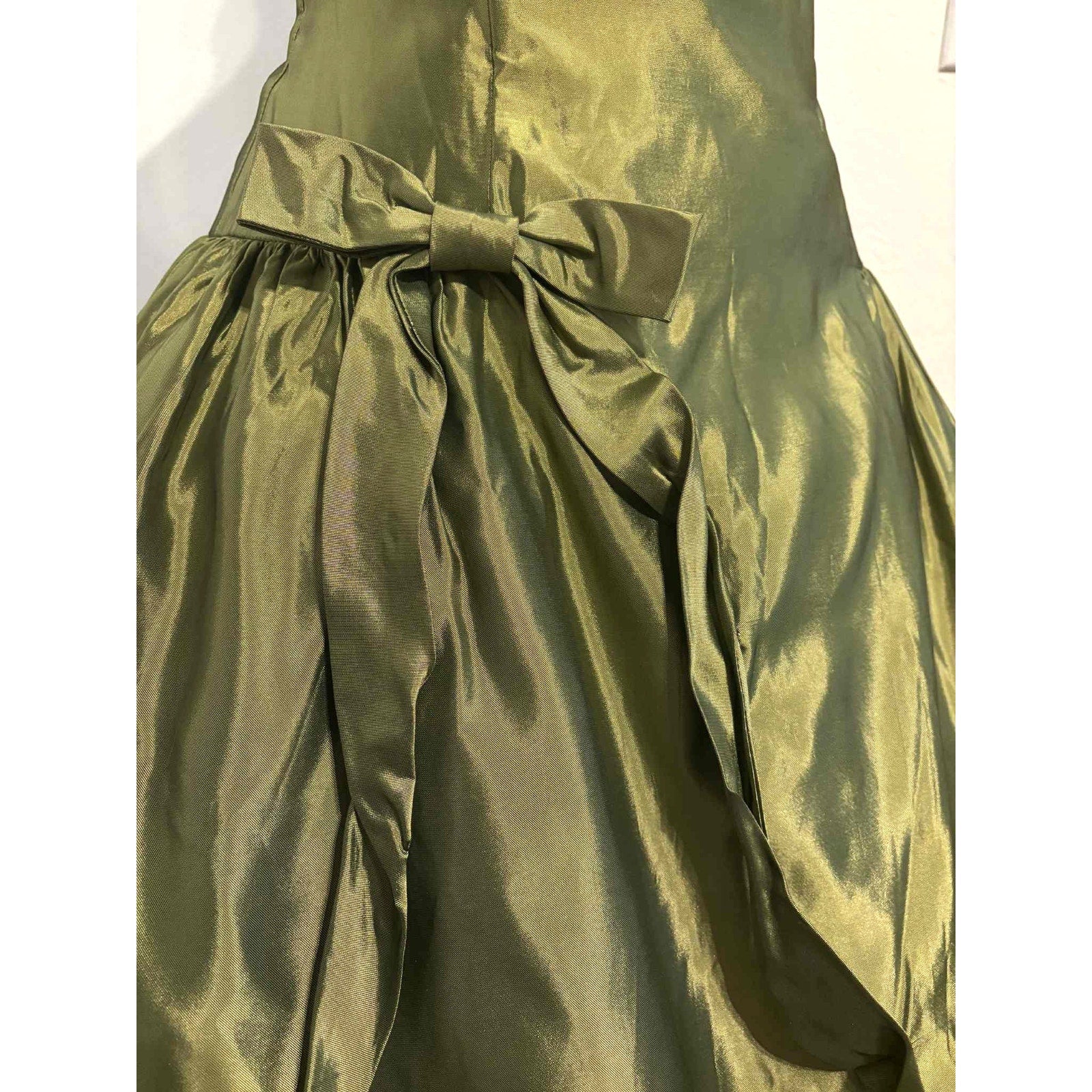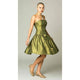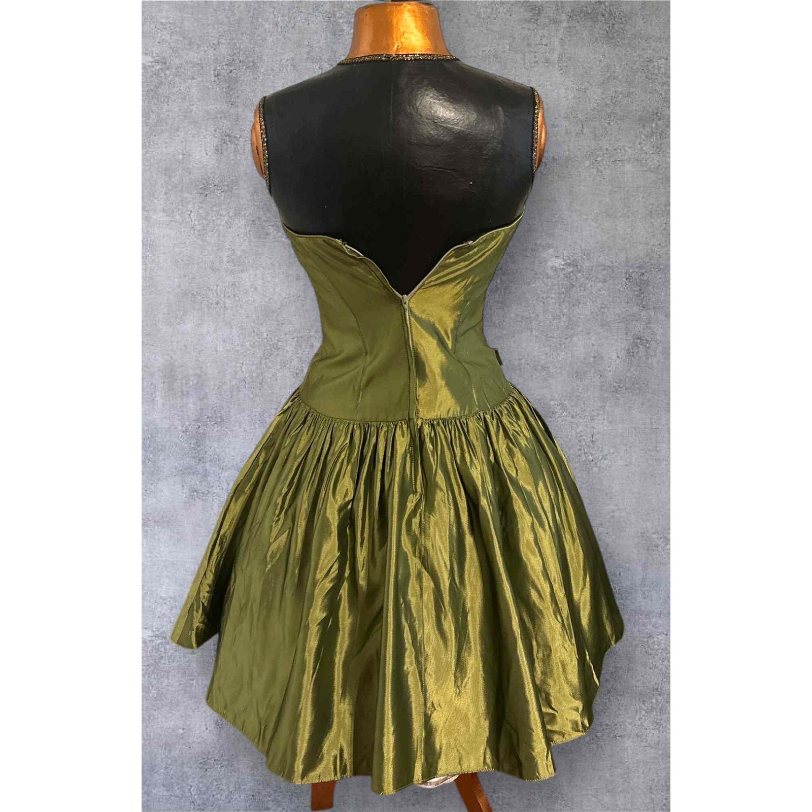 Step into classic glamour with this vintage Jessica McClintock strapless taffeta dress. Crafted in a striking shade of olive green, this timeless piece features a fitted bodice, a flattering cinched waist with a bow accent, and a voluminous full skirt that creates a graceful, twirl-worthy silhouette.