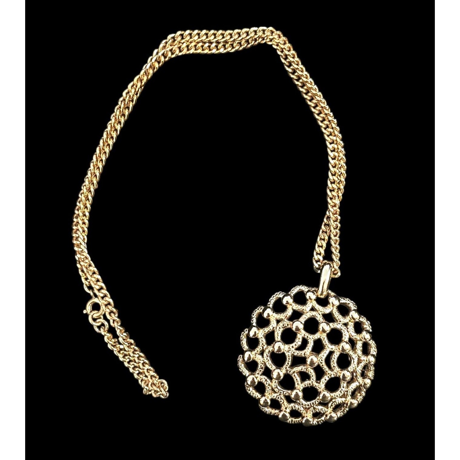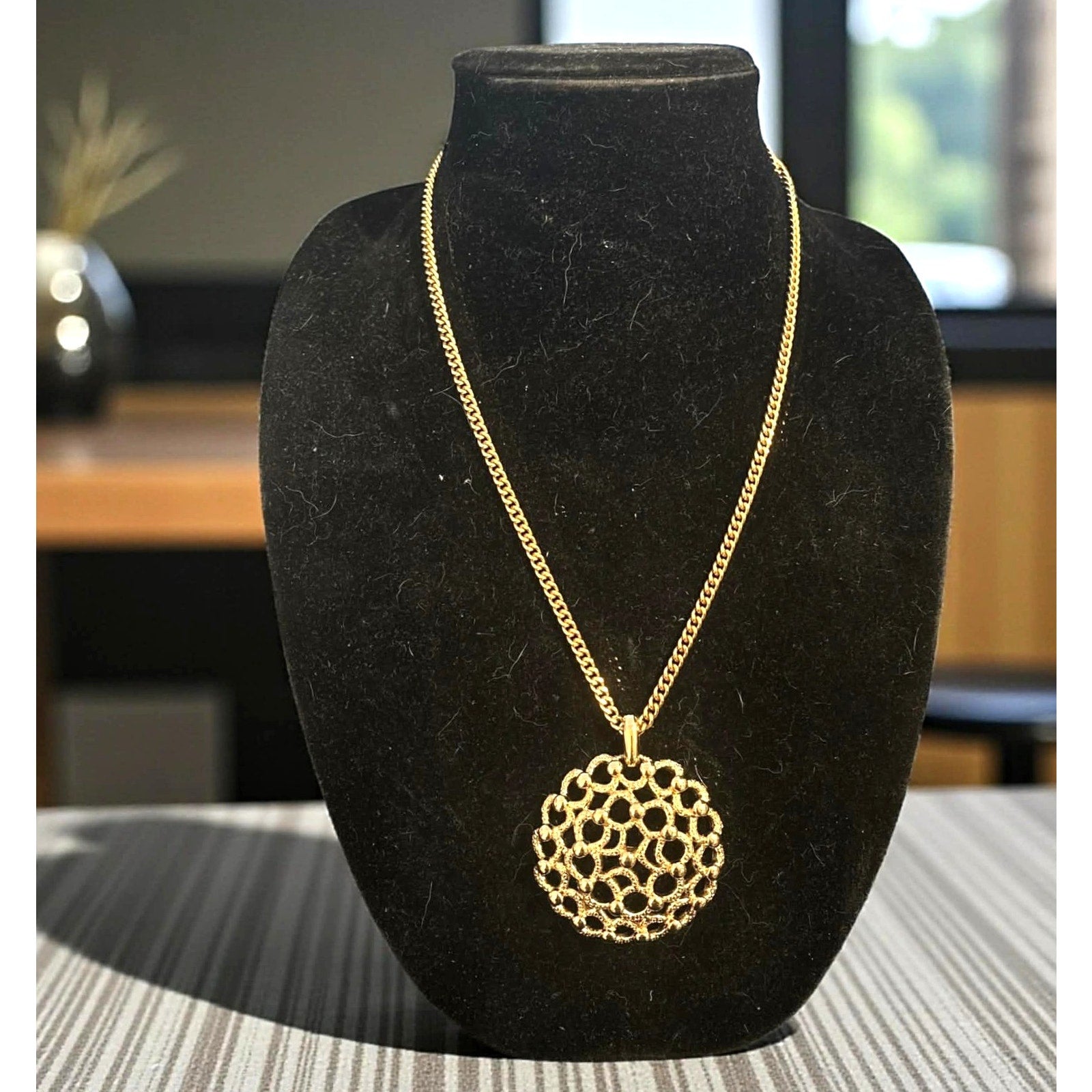 Elegant and timeless vintage Monet gold-tone pendant necklace featuring a large openwork filigree medallion with beautiful dimensional detail. The circular pendant has an airy lace-like design that catches the light, suspended from a classic gold-tone chain for a refined statement look.