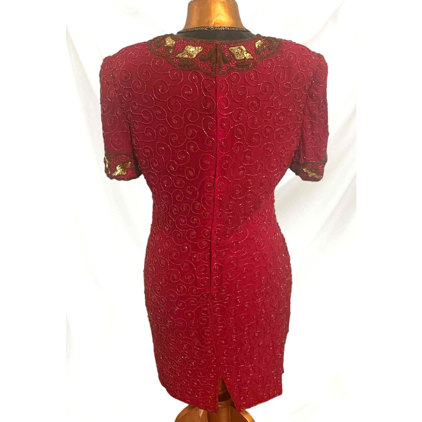 Elegant and timeless, this vintage Night Vogue dress is crafted from 100% silk with exquisite hand-beaded and sequin detailing throughout. The rich red base is adorned with intricate gold and red beadwork in swirling patterns and ornate trim along the neckline and sleeves — a true statement piece for evening events or holiday parties.