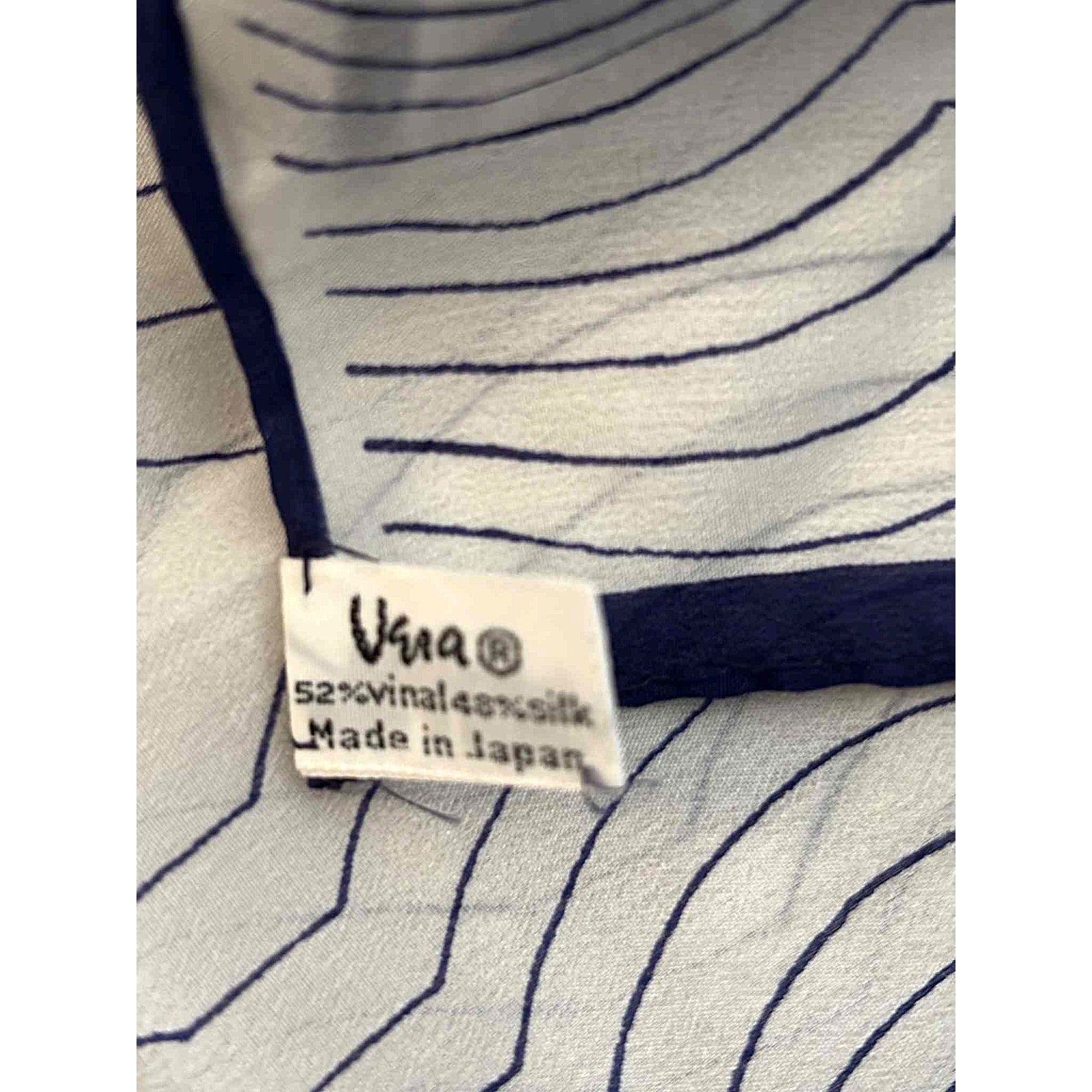Stunning signed with hang tag vintage VERA graphic silk blend sheer scarf in navy and white. Hand rolled edges. Measures 41.5" x 13.5." Made in Japan. Good condition!