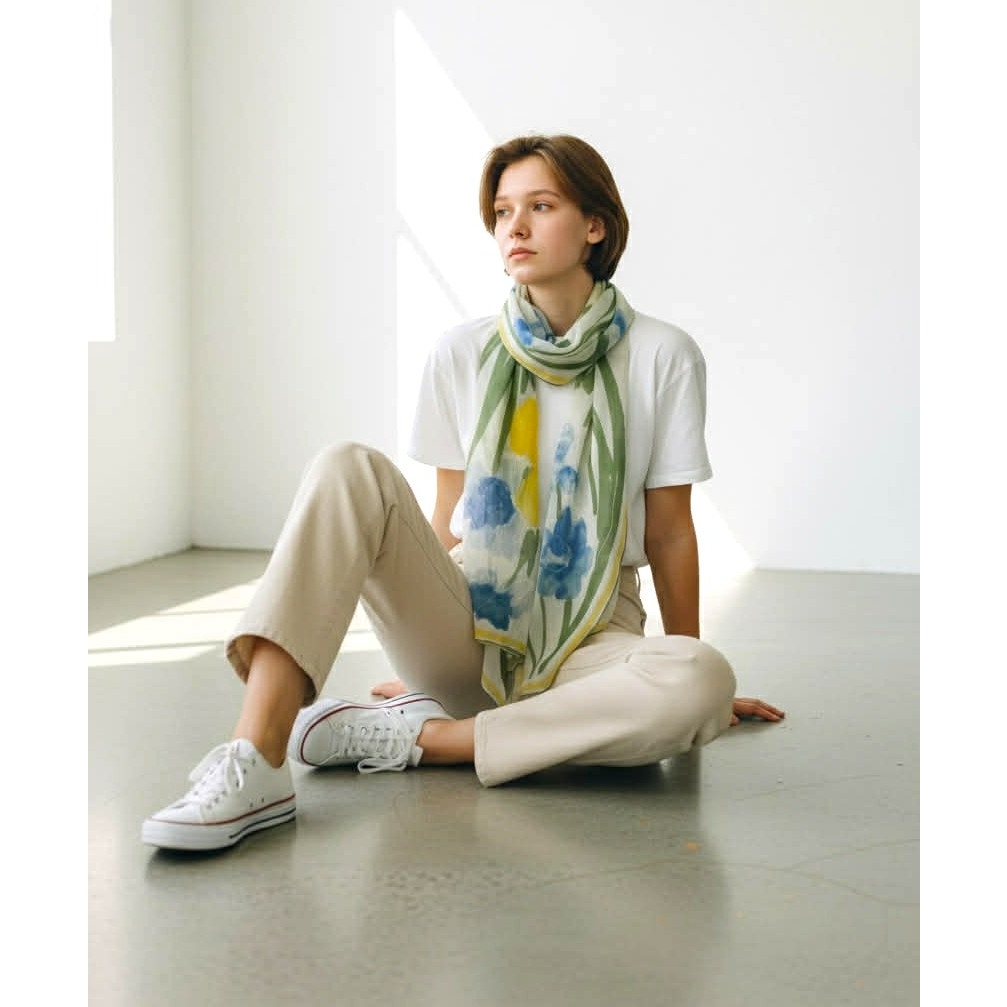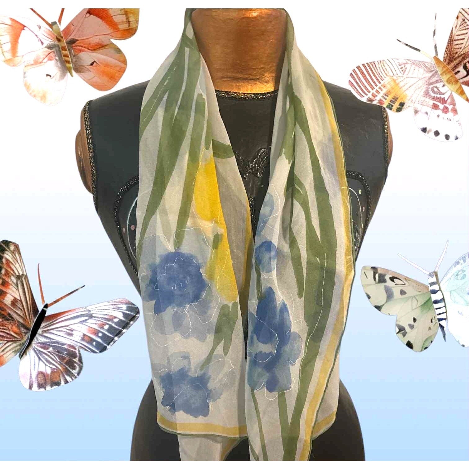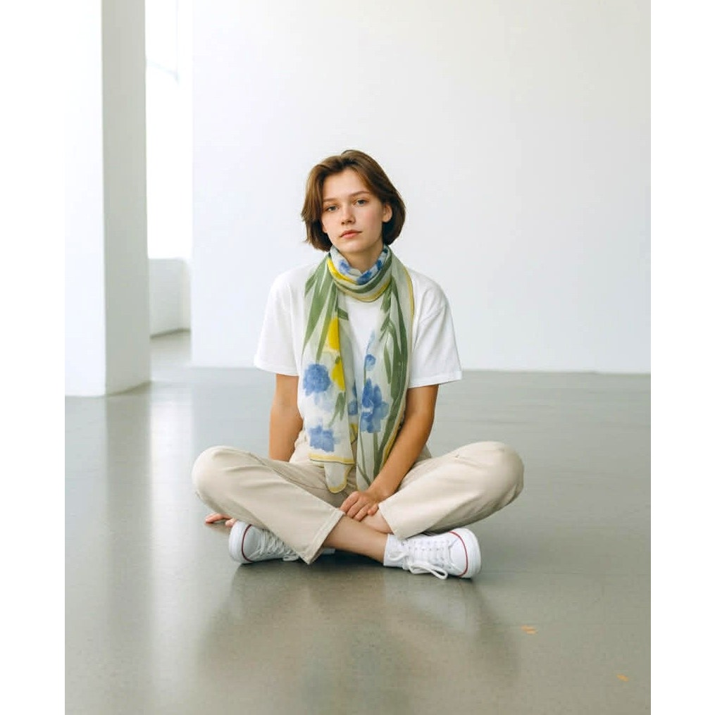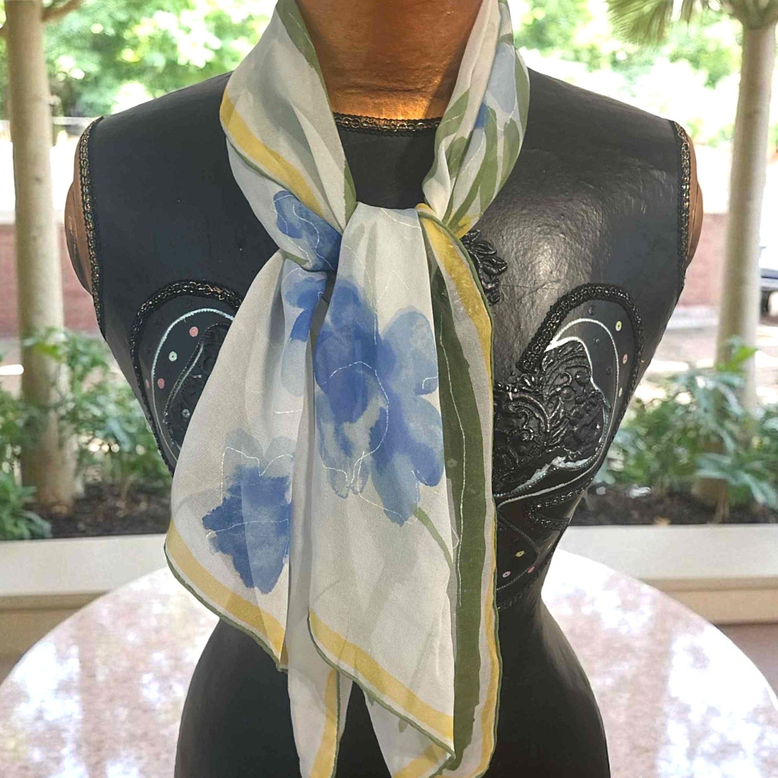 Stunning vintage silk chiffon scarf by renowned designer Vera Neumann. Featuring a delicate watercolor-style blue floral design with green and yellow borders, this piece showcases Vera’s iconic hand-signed “Vera” mark with the ladybug symbol.