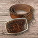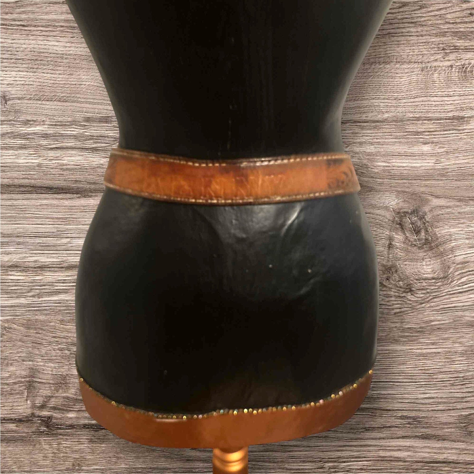 The belt itself is hand-tooled genuine leather, showcasing aged patina and craftsmanship that add authentic vintage character. The silver-tone buckle is removable and framed with etched detail. Belt has two length adjustments!