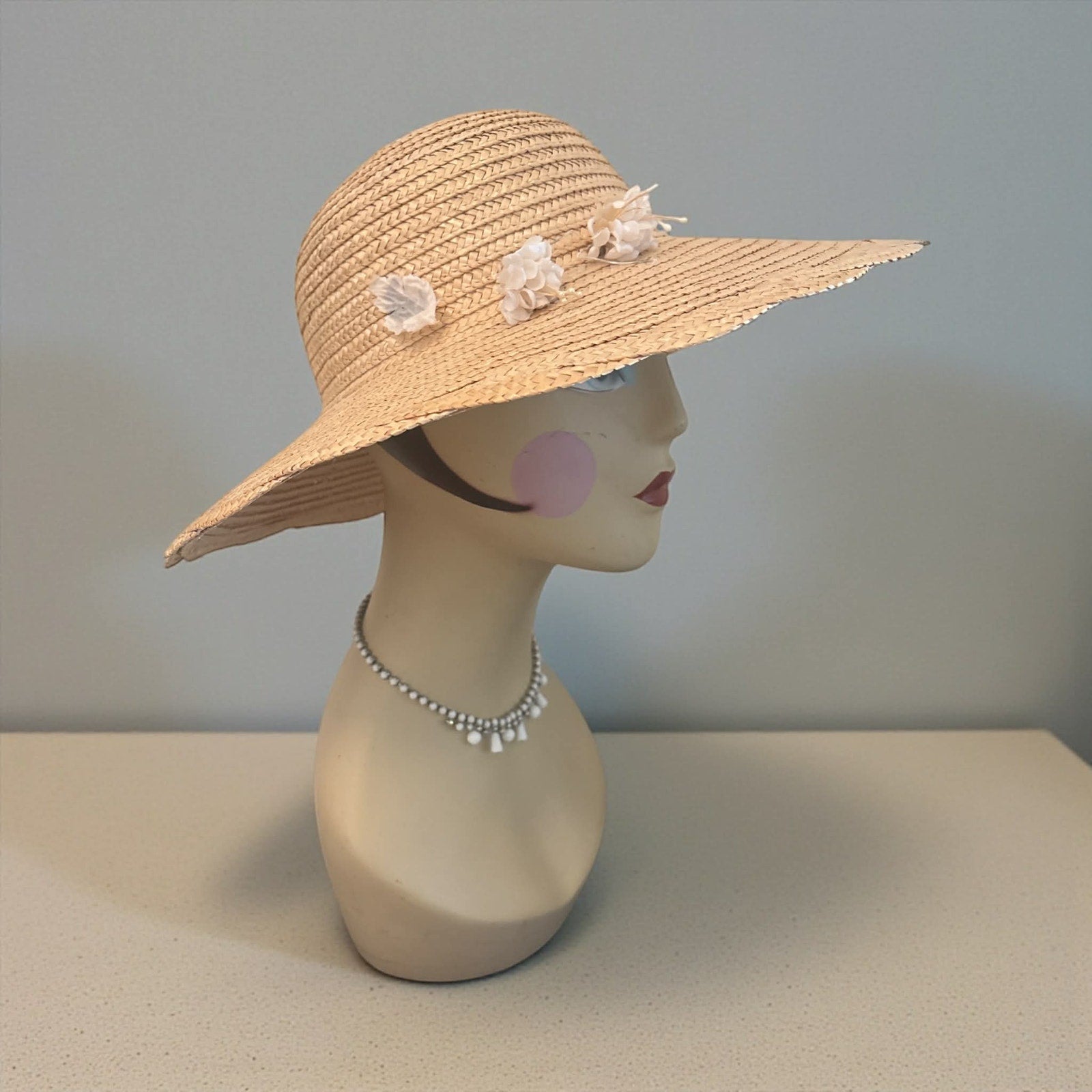 The floral embellishments appear to be applied with adhesive and may have been added later; originality of the flowers is unknown. The hat itself is in great vintage condition with no structural damage to the straw or brim, making it a lovely and wearable vintage accessory.
