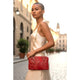 Elegant vintage leather handbag by Carlo Fiori of Italy, crafted in rich red leather with beautifully mixed leather construction including reptile-style textured panels-- a hallmark of Italian evening bags from this era. This timeless piece features a gold-tone chain strap, soft velvet interior lining, and a single interior pocket—perfectly sized for essentials.