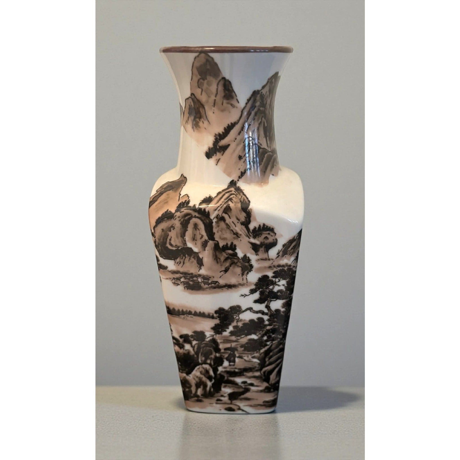 Vintage Japanese ceramic vase featuring a hand-painted scenic landscape design with mountains, trees, and flowing water. Finished with a glossy glaze and marked Made in Japan on the base.