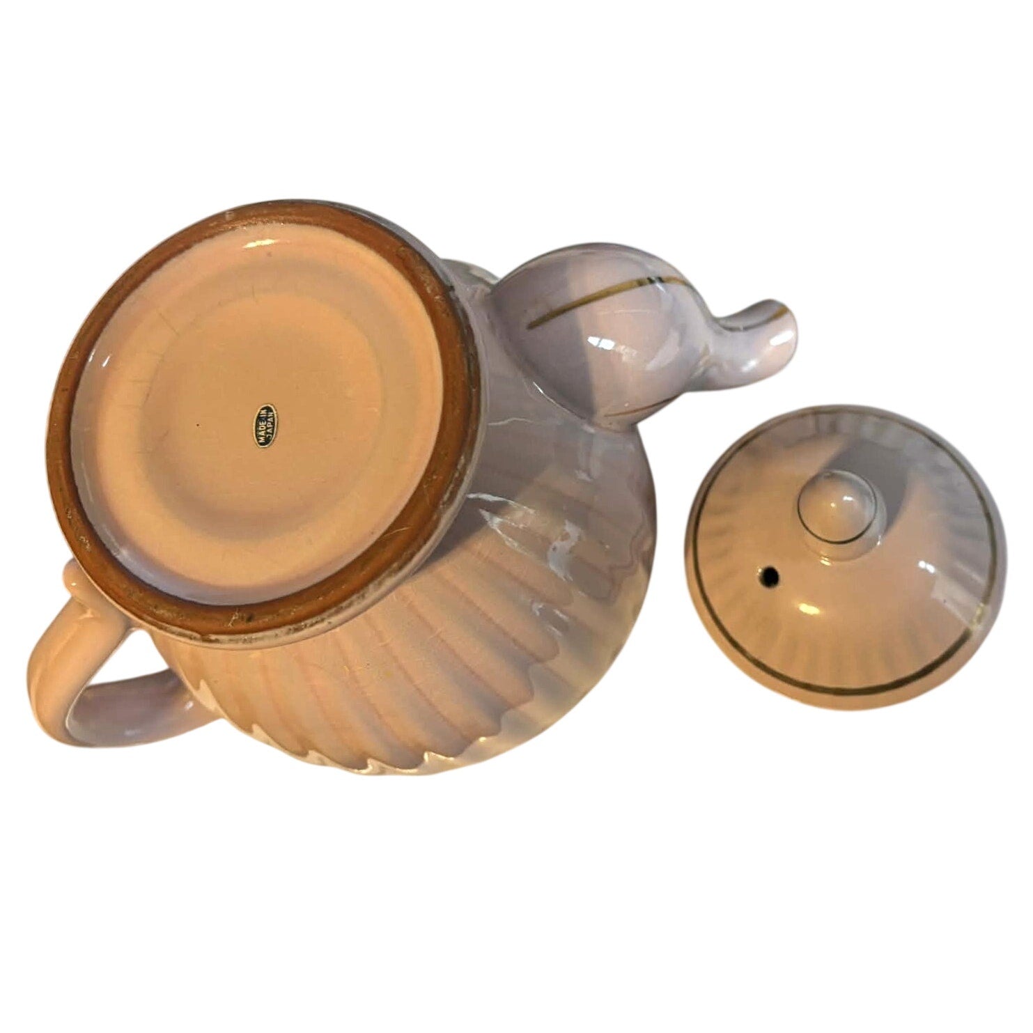 Vintage mid-century porcelain teapot made in Japan. Features a soft blush pink glaze with elegant gold trim and a delicate floral band. Ribbed/fluted body with a graceful curved spout and handle. Lid is removable.